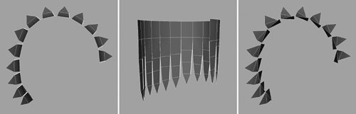| 2. | Switch to the top view so you are looking down on the strips (Figure 4.19, left). It looks like I got a bit carried away, rotating the strips to fit. First, using the Rotate manipulator, alter the rotations so the strips appear as flat lines in the top view. You will find that the same axis needs altering for each strip.