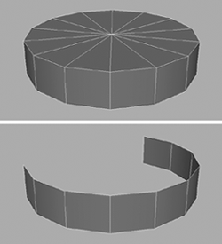 | 2. | Remove the top and bottom from the cylinder, as well as five quads from the back, giving you the shape in Figure 4.40 (bottom).