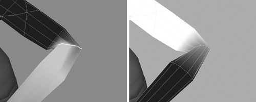 Fixing this will involves adding more polygons to the area, as illustrated in Figure 6.13 (right). We'll discuss that next. Adding Polygons to the Elbow We need to add some polygons to keep the elbow from pinching as it bends. These will lie close to the actual elbow. They will only be added at the front and the rear because the elbow only rotates around one axis; we don't need to worry about the top and bottom. 1. | To quickly get the joints back to their original position, right-click the first joint and select Assume Preferred Angle from the marking menu.