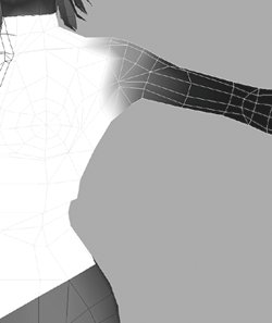 | Two of the main areas on a model that need to be tested are the arms and legs, in particular the elbows, shoulders, and knees. These areas are important because they bend the most as the character moves around the game world and interacts with the environment and with other characters. Setting Up the Arm Skeleton Let's start by loading the file called Kila_Optimized.mb and focusing in on her left elbow. You can see the elbow in Figure 6.1, and up to now there are no major problems with it. Let's put a basic skeleton in and see how it bends. 1. | Switch to the top view so that you are looking down on the arm. Switch to wireframe mode (press 4) so that you can see the joints as we place them.
