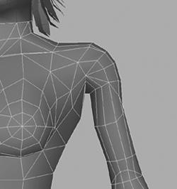| We are almost there, but the armpit area seems too high up, making the shoulder look too thin. 5. | While still bound to the skeleton, we can adjust the vertices around the shoulder, bringing the armpit down slightly, as you can see in Figure 6.22. Mesh tweaks after binding are generally not a good idea, but in this case it doesn't cause a problem since we'll be detaching the skeleton toward the end of the chapter.