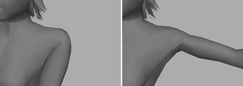 | As you can see in Figure 6.23, the shoulder now looks okay when deformed. Figure 6.23. The shoulder area now looks better when deformed.