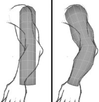| 3. | Starting with the arm, adjust the vertices to more closely match the curves of the arm in the image plane. First work in the front view (Figure 7.3), before moving on to the side view (Figure 7.4). Remember to rotate each row of vertices to match the orientation of the arm.