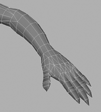 | When you're finished, save the new hand as Grae_Hand.mb. As you can see, you can easily achieve other, different hand styles by altering one base hand. There is no need to remodel a new hand completely from scratch. Next we will attach this new hand model to Grae's arm in the main model. 1. | Load the file called Grae_WithFeet.mb.