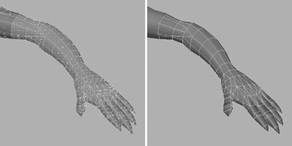 | 7. | With these polygons removed, go ahead and alter the hand until it looks more like Grae's (Figure 7.36, right).