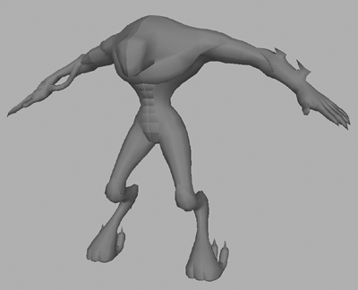 | Note If your budget won't allow the extra geometry, you could rely on the texture to add this detail to the stomach instead. Adding a bump map (see Chapter 9), or even a normal map (see Appendix A, "Normal Mapping in Maya"), will give the illusion of detailed geometry, even where there is none. This being said, these two techniques do have their restrictions and cannot always be used effectively. Figure 7.23. Smooth out the very top of Grae, making the back of his shoulders less angular.