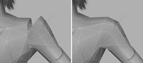 | 3. | As you can see in Figure 10.8, left, the shoulders are no longer shaped correctly, so work the vertices and smooth out both shoulders (Figure 10.8, right).