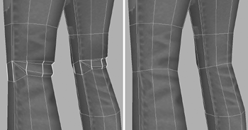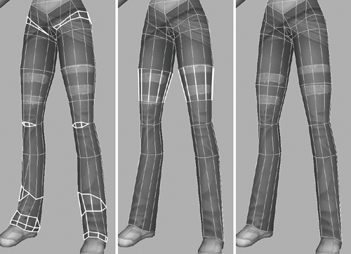 | 5. | We have a shallow angle on the thigh area. Select the edges shown in Figure 10.27, middle, and collapse them. The legs will look like those in Figure 10.27, right.