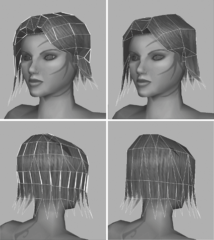 | 4. | Optimize the hair further, removing polygons not only from the outside, but from the fringe of hair at the forehead (Figure 10.21, left).
