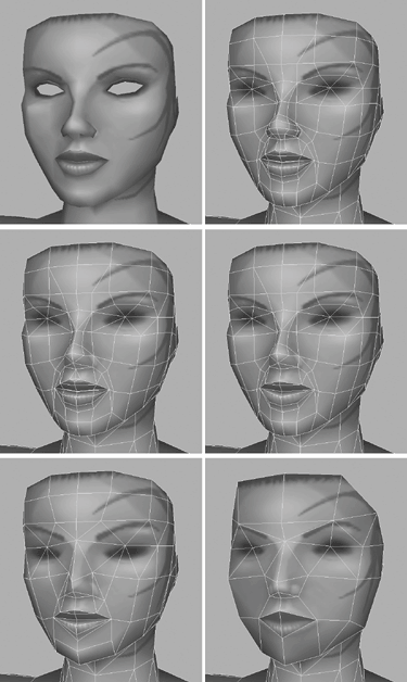 | 2. | By now you should have a good grasp of polygonal modeling, so go ahead and work on the nose and then the lips (Figure 10.23, middle). Finally, work your way around the face, collapsing edges there until you have a basic face like the one in Figure 10.23, bottom-right.