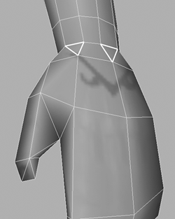 | You should now have a low-polygon mitten-type hand like the one shown in Figure 10.24d. The reduced hands can now be used to guide optimization of the arms. Limbs Reduction Because we reduced the hands, triangles will have appeared at the wrist area (Figure 10.25). This is because the sections there no longer match up to the ones where the hands attach to the arms. 1. | On each arm, follow the triangles, and select the edges all the way up Kila's arm. You should end up with each alternate strip selected (Figure 10.26, left).