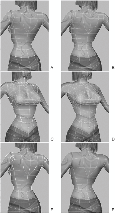 | 2. | There are quite a few areas to reduce on the torso; let's do them all at once. Follow Figure 10.30, selecting and collapsing the edges that are marked in white on both front (Figure 10.30c) and back (Figure 10.30e). After you make these changes, the torso should now resemble Figures 10.30d and 10.30f.