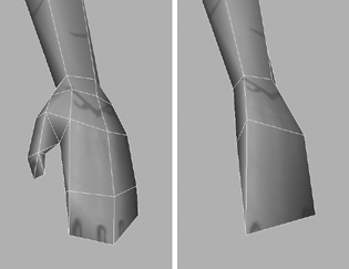 | That's about as much as you can remove at this stage, but she is still using 3878 polygons. Next we will go in and remove some areas of small detail in order to get closer to our 3000 limit for this LOD. Hands Although Kila's fingers are still visible at this level, they don't need to have much detail in them; it's sufficient if they merely "suggest" fingers. In designing the main hand, we included polygons around the joints so that the fingers would not pinch badly when bent. There is no need for these polygons at this distance, so we can remove them. Reduce the fingers down to basic cubes like the ones seen in Figure 10.14, right. If you are merely merging vertices or collapsing edges, the UV information should stay intact. Figure 10.14. Reduce the fingers down to basic cubes.