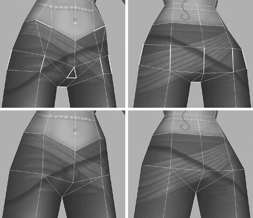 | 9. | When the legs are reduced, you will notice areas around the crotch and waist that can be optimized. At this level, polygons to aid deformation are not needed, so select and collapse the edges highlighted in Figure 10.47 top-left and top-right.