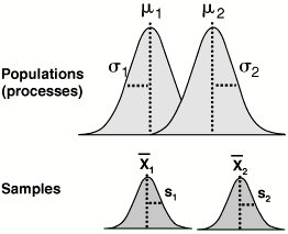 From the example results A sample of 100 data points was taken for each operator Bob's sample mean was 24.811, Jane's was 25.525 Bob's sample standard deviation was 0.973, Jane's was 0.904 The test is based on the hypotheses:μBob μJane = 0 (H0) versus μBob μJane 0 (Ha) There is a 95% likelihood that the difference between the population means lies between 0.975938 and 0.452062 The means of the samples are 5.38 Standard Errors apart (the t-value) The likelihood of seeing sample means this far apart (if the populations were perfectly aligned) is 0.0% (p-value), which is below 0.05; thus, the conclusion is that Bobs is performing significantly differently from Jane given the sample data. Other Options The preceding test with the hypotheses defined as The test is known as a two-tailed test, because (by the " " in Ha) it is not known whether the mean of population 1 is above or below the mean of population 2, and, hence, the test needs to cover both sides (tails). A one-tailed test on the other hand is used when it can be stated up front whether the mean of population 1 is above or below the mean of population 2. The hypotheses in this case is either: H0: Population (process) μ1 = μ2 Ha: Population (process) μ1 > μ2 or H0: Population (process) μ1 = μ2 Ha: Population (process) μ1 < μ2. A one-tailed test (greater than or less than) can detect a smaller difference between the means than a two-tailed test[95]. Given the choice, go with the one-tailed test if there is data to show which of the two population means is greater. [95] An explanation for this can be found in most statistical textbooks; Statistics for Management and Economics by Keller and Warrack is useful in this case. |
