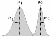 Figure 7.53.3. Measures of Center.  | Step 6. | Perform a Test of Equal Variance on the sample data sets. In simple terms, any test of centering (Step 7) looks to measure the distance from μ1 to μ2 in units of standard deviation. Figure 7.53.4 highlights the problem that if the variances of each population were different, then measuring the difference between them in units of standard deviation would be different using σ1 versus σ2. If the standard deviations are different, then the test should use a composite value known as the pooled standard deviation.