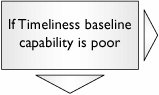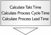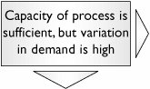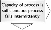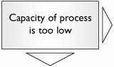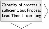 From applying these tools to timeliness, we should have gained an understanding of whether the issue is either |  | On average, the process does not have enough capacity (the Cycle Time is longer than its Takt Time). For more detail see "TimeTakt Time" and "TimeGlobal Process Cycle Time" in Chapter 7. The process will never generate enough entities to meet demand. Continue to Section B in this chapter. | |  | On average, the process has enough capacity (the Cycle Time is below the Takt Time), but the process fails intermittently. For more detail see "TimeTakt Time" and "TimeGlobal Process Cycle Time" in Chapter 7. On average, the process can meet demand (including peaks), but the process is not robust enough to do so on a continuous basis. Continue to Section F in this chapter. | |  | The Cycle Time is below its Takt Time, but the Process Lead Time is too long. For more detail see "TimeTakt Time", "TimeGlobal Process Cycle Time" and "TimeProcess Lead Time" in Chapter 7. The process can meet customer demand; however, when an entity is required quickly and is not available to ship from inventory, the time taken to generate a whole new entity from scratch is too long. Continue to Section G in this chapter. | |  | On average, the process has enough capacity (its Cycle Time is below its Takt Time), but variation in demand causes shortages in available entities intermittently. For more detail see "TimeTakt Time" and "TimeGlobal Process Cycle Time" in Chapter 7. The output of the Demand Profile tool (or Demand Segmentation tool if many entities are run through the process) will show spikes in demand beyond the current capacity of the process. There are two options in this case: Increase the capacity of the process, or smooth the demand from the Customer/market. Continue to Section B in this chapter to increase the capacity of the process. Continue to Section I in this chapter to smooth the demand from the Customer. |