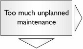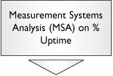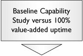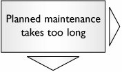 D. % Uptime Is Too Low Overview Processes are required to be generating entities (doing VA work) for 100% of the shift time. Any time they are not doing VA work can be considered downtime. Note that this is different from the definition typically used by maintenance personnel, which focuses on the availability of the process to do any work, rather than the process of actually doing work (and that work being all VA work). This is very similar to the measure known as Utilization, which considers % work time, but does not consider the delineation of value-added (VA) versus non-value-added (NVA) work. For a detailed explanation of % Uptime, refer to "Overall Equipment Effectiveness (OEE)" in Chapter 7, "Tools." Examples Industrial. Uptime of a line, vessel, or plant Healthcare. Surgery uptime (incision to close) Service/Transactional. Uptime of a server or carrier Measuring Performance In considering uptime, typical primary measures would comprise Often it is useful to also consider the uptime relative to a 24-hour working week, multiple shifts, and so forth, and report these as separate numbers to show the true available capacity of the process, not only that which is limited by current staffing. Tool Approach If not already done in a previous step, then apply the sequence of tools as follows: |  | Focus should just be on measuring validitya sound operational definition and consistent measure of % Uptime versus a detailed investigation of Gage R&R. For more details see "MSAValidity" in Chapter 7. Determine an exhaustive set of categories of time (e.g., planned maintenance, unplanned maintenance, changeover, etc.). Having a category called "Other" tends to swallow up informative events and consequently any opportunity for improvement, so be as specific as possible. | |  | Use the process operators to capture data for the time categories as defined in the preceding MSA. Ensure they have a clear understanding of the intent of the project to try to reduce the Hawthorne Effect[2] (the Champion might provide valuable input here). One week's data typically provides a reasonable starting sample for all but the slowest cycling processes, but continue the data capture for long enough that the process time categories are all hit. Consider using historical data to represent large downtimes due to maintenance or forced shutdown. | |  | Categorize the total (shift) time into uptime and all the possible downtime buckets using a Pareto Chart. Use the tool to focus the next steps of the project on the biggest sources of lost uptime. There might also be small sources that can be tackled very easily with a quick hit (i.e., negligible cost, dumb stuff). Take these opportunities immediately. | Options will be either | | |  | If the changeover for the whole process or for a single step is too long, go to Section O in this chapter. | |  | If time is spent reworking, inspecting, scrapping, or reacting in any way to defective entities, it is a quality-related problem and should be addressed using the roadmap in Section C in this chapter to eliminate the source(s) of the defects. | |  | If there is too much unplanned maintenance or the process simply breaks down on a regular basis, go to Section P in this chapter. | |  | If there is too much planned maintenance or planned maintenance takes too long, go to Section N in this chapter. | |  | This outcome will not be examined in detail in this book. Consider using different staffing models, staggered breaks, and so on. Use the operators themselves to come up with the mechanisms to keep the process running during breaks. This helps ensure buy-in, which is typically the most difficult factor in these situations. Consider just keeping the bottleneck (the rate-determining step) in the process running during the breaksit will require a buffer of inventory ahead of the bottleneck to achieve this. |