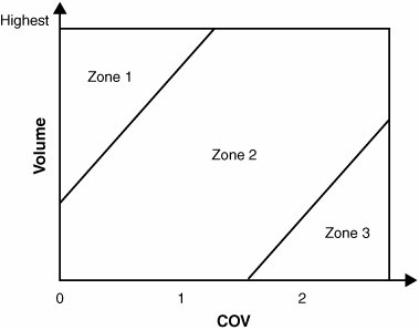 | Interpreting the Output Interpreting the Demand Segmentation graph depends heavily on application but can be addressed by breaking the graph into zones, as shown in Figure 7.16.2. Figure 7.16.2. Demand zones.  Application: Replenishment Demand Segmentation can be applied to materials management and specifically replenishment as replenishment to a Customer or replenishment of materials internally or from a Supplierfor example, the delivery of product to a Customer, a materials delivery to a line, or a medications delivery to a Care Unit. In this case, the zones would be treated as follows: Zone 1Deliver direct to line. High volume, low variation materials usage is so smooth that it allows us to add service value to the Customer by managing their inventory for them. Materials would be delivered on a rate-based system directly to the point of use (POU). There is probably no need to keep anything more than a small buffer of Finished Goods at the end of the supplying process for these types of entities. Payment could be based on a Blanket Order and then Call Offs made as entities are used. Zone 2Pull System from Customer. For the middle majority, simple pull triggers from the Customer would allow replenishment when needed (see "Pull Systems and Kanban" in this chapter). If the Global Process Lead Time for entities in this Zone were too long (for example, it is impossible to process the entity from scratch and get it to the Customer POU within acceptable timeframes), then a solution would be to replenish from stock, by keeping a small inventory of Finished Goods at the end of the supplying process. See also "TimeGlobal Process Lead Time" in this chapter. Zone 3Make (or Deliver) to order. High variation, low volume gives such unpredictable demand that it forces the Supplier to deliver only when there is an order. If the Global Process Lead Time for the supplying process is short enough, then there isn't too much of a problem. However, if the Global Process Lead Time is beyond acceptable bounds for delivery Lead Times, then either: The supplying process (or the POU) has to stock inventory, which is probably highly unpalatable Work should be done quickly to reduce the Global Process Lead Time The validity of having the entity types in the portfolio should be questioned (see the next application section) Or the worst case is that the promised delivery time needs to be extended with the Customer