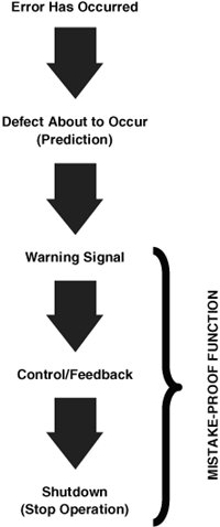 34. Poka Yoke (Mistake Proofing) Overview Poka Yoke or Mistake Proofing is an important Control tool. It is also the strongest form of Control, except for designing out the process step completely. In simple terms, Poka Yoke ensures that an action cannot be done incorrectly and defects are prevented from ever occurring. Mistake Proofing has been sometimes referred to as Fool Proofing, or Idiot Proofing. It is certainly best to steer well clear of these terms due to the negative connotations. Also, from my experience, it seems to be that the cleverest "Fools" and "Idiots" make the biggest mistakes! Defects in processes rarely tend to "just happen." There is usually a sequence of events that lead up to the defect, and this is the focus of Poka Yoke. The Team must be able to track back through the series of causal events that can lead up to a defect and place a Control as early as possible in that chain. Traditional defect Control systems often focus on detection as shown in Figure 7.34.1. The defect has to occur before any remedial actions are taken. Figure 7.34.1. Traditional defect control path.  Systems of this form rely on the ability to successfully detect a defect after it has occurred. Only then are any actions taken to control the situation. Poka Yoke takes the more proactive route by using the philosophical approach of Y = f(X1,X2,..., Xn). If it is possible to identify Xs that drive most of the behavior in the Y and can cause the Y the exhibit defects, then by focusing on the Xs it should be possible to even prevent the defect occurring at all. Thus, if there is an error in an X and it is detected, then it is possible to predict the impending defect and react ahead of time, as shown in Figure 7.34.2. Work in Poka Yoke, therefore, is focused heavily on error detection as early as possible in the chain of events, to give enough of an early warning to an operator prior to a defect ever happening. 7.34.2. Poka Yoke defect control path.  Logistics Poka Yoke is one of a series of Control tools, which are done as a team sport and best performed by the people closest to the process, running the process on a day-to-day basis. It is not typically done as a separate event, but is usually built into the Team meetings during the Control Phase. Roadmap The following roadmap assumes a reactive effort in that a problem already exists, such as during a Process Improvement project. Ideally, however, mistake proofing is best used in a proactive mode during Process Design to design out the defect from the beginning. The roadmap is iterative at times and involves some trial and error; such is the nature of preventing humans from making mistakes. Step 1. | Describe the defect or potential defect. Refer back to the VOC work done in the Define Phase, along with the FMEA. Mistake Proofing takes time and resource, so focusing on the highest Risk Priority Numbers (RPNs) in the FMEA pays dividends. If this is a defect that currently occurs in the process then determine the approximate defect rate.