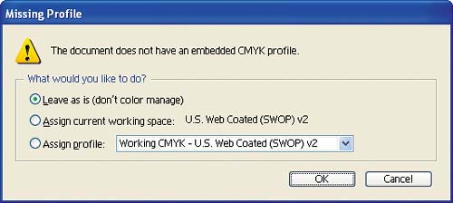 Leave As Is (Don't Color Manage) uses the working-space profile (CMYK in this case) as the source of the data but does not tag the file. Assign Current Working Space uses the working-space profile (a CMYK SWOP profile in this case) as the source of the data and tags the file with the profile. This is generally the best option if you don't know the source of the data. Note  | If you choose Assign Profile and then select a different profile from the working space, Illustrator displays the Assigned Profile Mismatch dialog box, which asks whether you want to convert to the working space or leave the current document space. You should select the embedded profile. |