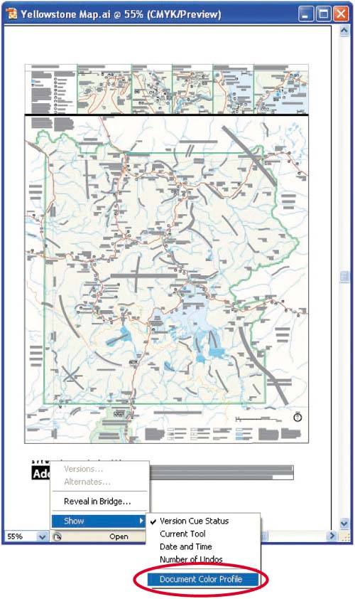 | Working with Placed Artwork Color management of vector artwork gets more complicated when you place artwork or images in Illustrator from another application. When you place an image into an Illustrator illustration, it includes a linked copy of the image in the file. How Illustrator color manages the placed art depends on the color state of the file: If the placed file does not contain an embedded profile and is in the same color mode as the Illustrator document, no color conversion is performed on the placed file. If the placed file does not contain an embedded profile and is in a different color mode from the Illustrator document, the file is converted using the working-space profile as the source. For example, if you place an RGB image in a CMYK illustration, the default RGB working-space profile is used as the source and the default CMYK working-space profile is used as the destination. If the placed file contains an embedded profile but is in a different color mode from the Illustrator document, the color values are converted using the embedded profile as the source and the document's working space as the destination. If the placed file contains an embedded profile and is in the same color mode as the Illustrator document, the conversion is dictated by the Color Management Policies settings in Illustrator's Color Settings, which we have set to query us when a mismatch or missing profile occurs. In this case, Illustrator will ask if we want to perform the conversion according to the policy settings. The best solution to simplify the process of compositing artwork with different source profiles is to first convert each file to the same working space upon opening the file and then place or paste the artwork into an Illustrator file. Assigning Profiles in Illustrator If you have a file without an embedded profile, you can assign a profile to it in Illustrator either when opening the file (by choosing Assign Profile in the Missing Profile dialog box) or after the image is open (by using the Assign Profile command). Here's how: 1. | Launch Illustrator CS2 if it's not already open and choose File > Open and the file Yellowstone Map.ai, which comes with Adobe Illustrator CS2 and is located in the C:\Program Files\Adobe\Adobe Illustrator CS2\Cool Extras\Sample Files\Sample Art folder.