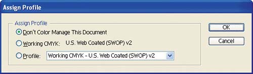 Assign Profile functions much like the Missing Profile dialog box that is presented when you open a file that doesn't have a profile. Assign Profile lets you choose either the current working-space profile or a different profile for the file.