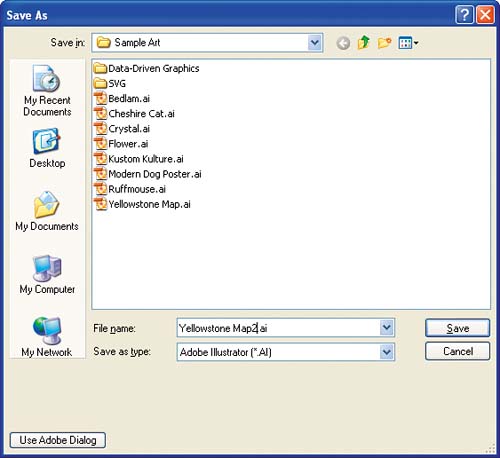 | 7. | In the Save As dialog box that appears, change the filename so that you don't overwrite the original. Then choose Adobe Illustrator from the Save As Type drop-down menu and click Save.