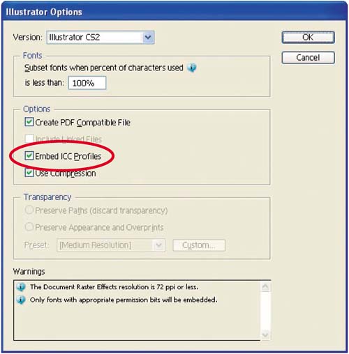 Figure 7.12.  The Embed ICC Profiles option instructs Illustrator to embed the current working-space profile in the file. Illustrator supports embedding profiles in the Adobe Illustrator Document and Adobe PDF formats. It does not support embedding profiles in EPS files. The only way to embed a profile in an EPS file is to use Photoshop to convert the EPS to a bitmap image and embed a profile when saving.