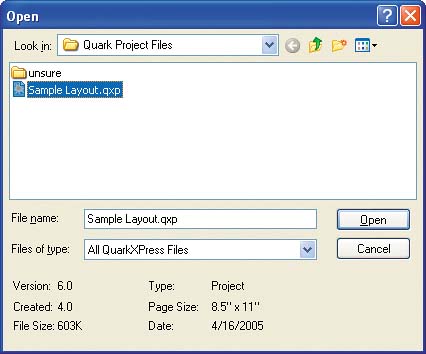 | 2. | Choose File > Open, and navigate to and open Sample Layout.qxp, located in Windows XP Color Management Project Files > Chapter 8. (You should have already downloaded the project files from the book's Web site to this folder on your hard drive.)