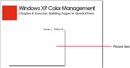 | Creating documents often involve a variety of elements, including images, artwork, and text. Each of these may have its own color source and color space. For example, a page may contain images from a scanner (in RGB or CMYK), images from a digital camera, artwork in EPS format that is typically in CMYK, and a number of colors defined in the application that can be in RGB or CMYK or a named color space such as PANTONE. When you're building pages, it's important that each element be accurately tagged with the source of the color data another reason why embedding profiles is key. In this section, we'll build a page in QuarkXPress using several elements, ensuring all the while that each is properly color managed. Placing Images on the Page Placing digital images onto a page layout with color management is relatively easy to do especially if you've implemented color management in your image-editing application. In this exercise, we'll add an image to a QuarkXPress document. 1. | Launch QuarkXPress, if it is not already open.