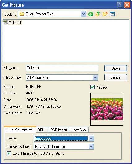 | 5. | In the Get Picture dialog box, navigate to Windows XP Color Management Project Files > Chapter 8 on your hard drive and select the Tulips.tif file. When you select an image to place in a picture box, the Get Picture dialog box displays information about it.