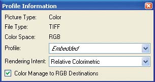 For example, the Profile drop-down menu indicates whether the image contains an embedded profile, as is the case with Tulips.tif. (It unfortunately does not identify which profile is embedded.) If you want to change the source profile for the image, select a profile from the Profile drop-down menu.
