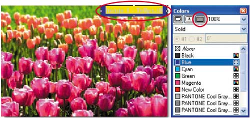 | 5. | Select the Image Tulips.tif text box. In the Colors palette, select the Fill button (the empty rectangle) and ensure that Solid is displayed in the pop-up menu. Then select a color to fill the text box with I've selected blue in the following example.