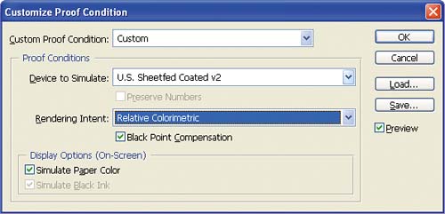| 4. | In the Customize Proof Condition dialog box, from the Device to Simulate drop-down menu, select a press profile, such as U.S. Web Coated (SWOP) v2.