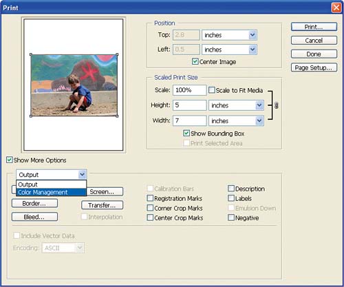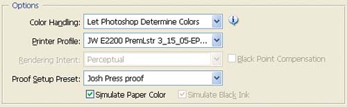 | 8. | In the Options section, set Color Handling to Let Photoshop Determine Colors, and from the Printer Profile drop-down menu, choose the profile for your printer. From the Proof Setup Preset menu, choose the saved proof setup file (see Step 10 in the previous exercise). Select the Simulate Paper Color option.