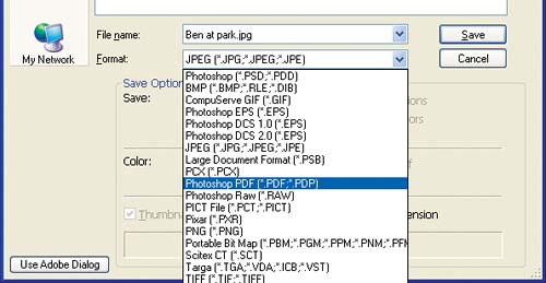 Photoshop can save RGB, indexed color, CMYK, grayscale, bitmap-mode, Lab color, and duotone images in PDF. Our Ben at Park.jpg file is an RGB image, so there's no problem.