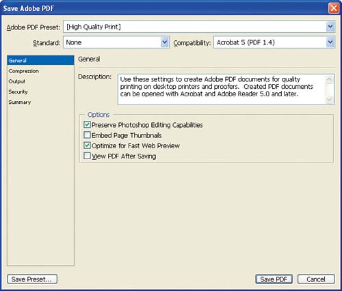 Figure 9.17.  The Save Adobe PDF dialog box has three main sections. The first section contains drop-down menus for selecting preset settings to create PDFs and designate which PDF version you want to use. For the purposes of this exercise, we'll leave these set to the default settings. If you use the Photoshop PDF format to share images with colleagues or clients, you may want to save your settings as a preset, so that you don't have to make setting selections each time you save an image.