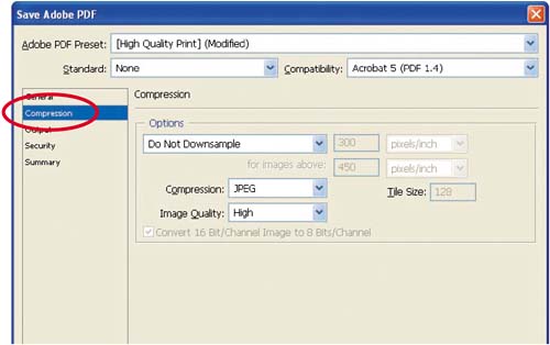Figure 9.18.  Compression options let you instruct Acrobat to compress or not compress the image, and if you do choose compression, specify how much compression you want. For the purposes of this exercise, we'll choose not to compress the image; however, if you are sending images in PDF format via e-mail, I recommend compressing them.