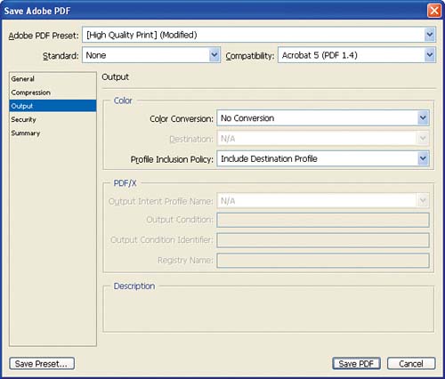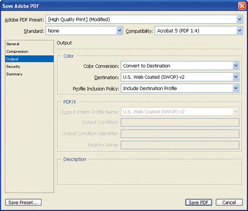 Figure 9.19.  The Output options let you set color management functions used in creating the PDF. We'll do that next.