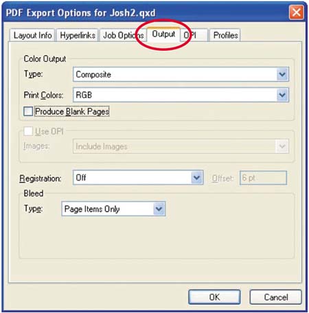 | 8. | In the PDF Export Options dialog box that appears, click the Output tab.