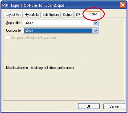 The PDF Export Options Profiles tab lets you specify the profiles used when the document is converted to PDF. The options are similar to those on the Profiles tab of QuarkXPress's Print dialog box: There are Separation and Composite drop-down menus and a Composite Simulates Separation check box.