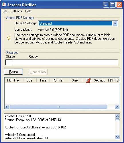 | Generating PDFs Files Using Acrobat Distiller Acrobat Distiller, which is a component of Adobe Acrobat Professional, provides advanced controls and greater workflow flexibility in the conversion of documents to PDF. To use Distiller, you first print your document from its originating application, such as QuarkXPress, to a PostScript or EPS file rather than to an output device. If the application supports color management if it tags the file and its components with embedded profiles Distiller will include those tags in the resulting PDF file just as if you'd printed it with color management to an actual printer. How color data is converted from the source document to the PDF document depends on how the color management preferences are set in Distiller. Distiller uses the same Color Settings file as the rest of the Adobe Creative Suite, but you configure the preferences a bit differently. In this exercise, we'll apply the Color Settings file we created in Photoshop to Distiller's Acrobat PDF settings, and then we'll create a PDF file of the QuarkXPress document that we printed to PostScript in the previous exercise. 1. | Launch Acrobat Distiller. The Acrobat Distiller window appears.