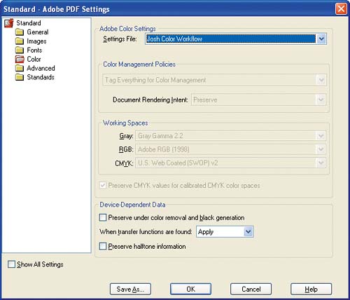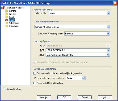 Leave Color Unchanged does not change the color values during the conversion process and does not embed profiles in the PDF file. This setting can be used in a tightly calibrated closed-loop environment where color is managed "by the numbers." Tag Everything for Color Management tags all objects with working-space profiles unless they contain embedded profiles. These profiles are used as the source color spaces when the PDF file is proofed or printed. No color conversion is performed during the PDF file creation. This is the ideal option if you want to create a PDF file that can be used as a comp, soft proof, or proof, or to generate separations (which we'll cover later in this chapter), and it was chosen in my custom photo workflow. Tag Only Images for Color Management works the same as Tag Everything, except that only images are tagged. All other elements are untagged. Convert All Colors to sRGB converts all color values to the sRGB space using embedded and working-space profiles as the source of the data. Although sRGB is a device-independent color space, it is not large enough to be useful for printing. This option is useful when the PDF file will be used on the Web. Convert All Colors to CMYK converts all color values to the CMYK space using embedded and working-space profiles as the source of the data. This option is useful when the PDF file will be sent to a commercial printer for printing. The Document Rendering Intent option determines how out-of-gamut colors will be mapped during the PDF conversion process. This option can be overridden by the selection of a rendering intent in the Print dialog box of an application.