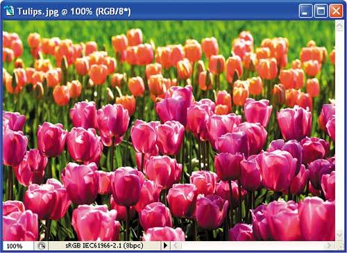 The best way to prepare your files for the Web is to convert the color data from its working color space to the target color space after you've edited the image. For example, if you intend to post an image to a Web site, you would convert the image to sRGB and embed the profile in the image. This ensures that the file is in the correct color space for the medium; the profile will be used by any color-management-aware application, such as Adobe GoLive, that supports color management by recognizing and embedding profiles in images. 1. | Make sure the tulips.jpg image is still open in Photoshop.