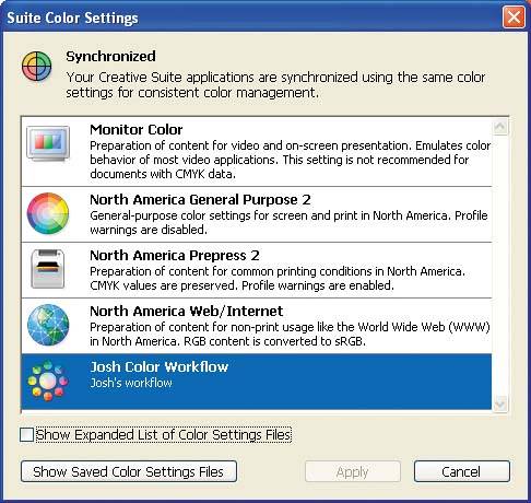Much like the other CS2 applications, Bridge automatically picks up the color settings that have been set in Photoshop, which ensures that previews of images and illustrations are color managed in Bridge. In this case, Bridge has automatically selected the Josh Color Workflow file we created in Chapter 5. |