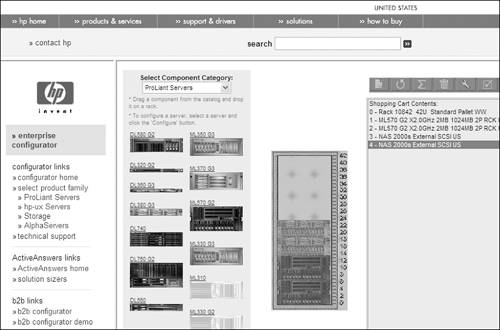 | The HP Enterprise Configurator utility, shown in Figure 10-11, is the replacement for the Rack Builder Online utility as of February 2004. The Enterprise Configurator offers new and enhanced Web-based services for configuring one or multiple racks through the Custom Builder configuration tool. Figure 10-11. HP Enterprise Configurator interface.  Using a simple guided interface, you can create rack configurations for HP ProLiant servers and StorageWorks products. The Custom Builder configuration tool has two user modes: Let Me Build a New Solution Myself For experienced users who are familiar with the HP product line and with applicable functional and regulatory requirements. This mode does not perform any of the calculations necessary for automatically selecting and sizing rack components. Help Me Build a New Solution For users who would like help in selecting and sizing racks and rackmount components. This mode directs you through the HP Enterprise Configurator using a simplified user interface, which includes an interview session. This mode automatically performs the calculations necessary to properly size power components in accordance with functional and regulatory requirements. The rack configurations are created using a complete and current database that includes all HP rack-mountable products. The Custom Builder tool helps to manage the increasing complexity of high-density environments by enabling users to preconfigure racks for more efficient management of their data center. The configuration tool can simultaneously configure multiple racked solutions of HP servers and HP storage and connectivity based on user requirements, and quote an estimated price for each configuration. After a rack is built, you can still make changes as long as the Rules for Racks system is met. 10.3.1 Custom Builder Configuration Tool Functions The functions of the Custom Builder configuration tool include the following: Automatic configure and quote capabilities Each component displays a list price, and the tool calculates a total configuration and budgetary quote. Customizable server options You can configure accessories within the server and place custom servers within a rack. Increased product support Custom Builder provides current HP product information for ProLiant servers and StorageWorks products. Simplified custom manufacturing instructions You can add customer intent notes to individual components for specific factory configurations. Online configuration assistance from HP Contact Centers Click the phone icon to send the configuration to an HP Contact Center inside sales representative, who will contact you with pricing information. Timely support of new server, storage, and option components New product information is updated when products are launched. Hyperlinks embedded in the pages provide immediate access to information and QuickSpecs from the HP Web site. Rack configuration validation The automatic validation functions ensure that rack configurations are operationally complete with all necessary accessories. Configuration-specific power protection The power-sizing function calculates the appropriate power protection based on components included in the configuration. Graphic representations of rack configurations You can view rack configurations and drag and drop individual components to specific locations quickly and easily to customize configurations. Reporting and exporting options You can choose from multiple report formats such as Microsoft Excel, Word, and others. The Custom Builder replaces the Rack Builder Online. You can find more information about the Enterprise Configurator and Custom Builder at http://h30099.www3.hp.com/configurator. |