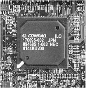 | The iLO is an application-specific integrated circuit (ASIC) embedded on the system board on select ProLiant servers, as shown in Figure 17-2. iLO consists of an intelligent processor and firmware that provide standard and advanced levels of Lights-Out functionality. Figure 17-2. iLO chip.