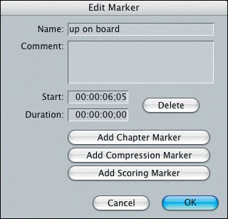The Edit Marker dialog box has additional options to explore, such as adding a chapter marker or compression marker if you're going to be creating a DVD. You can create scoring markers if you are working with the Apple music composition application, Soundtrack. You can also delete a marker in this dialog box.