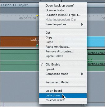 | 9. | Ctrl-click the back up again clip, and from the bottom of the shortcut menu choose "belly down" to go to the "belly down" marker location.